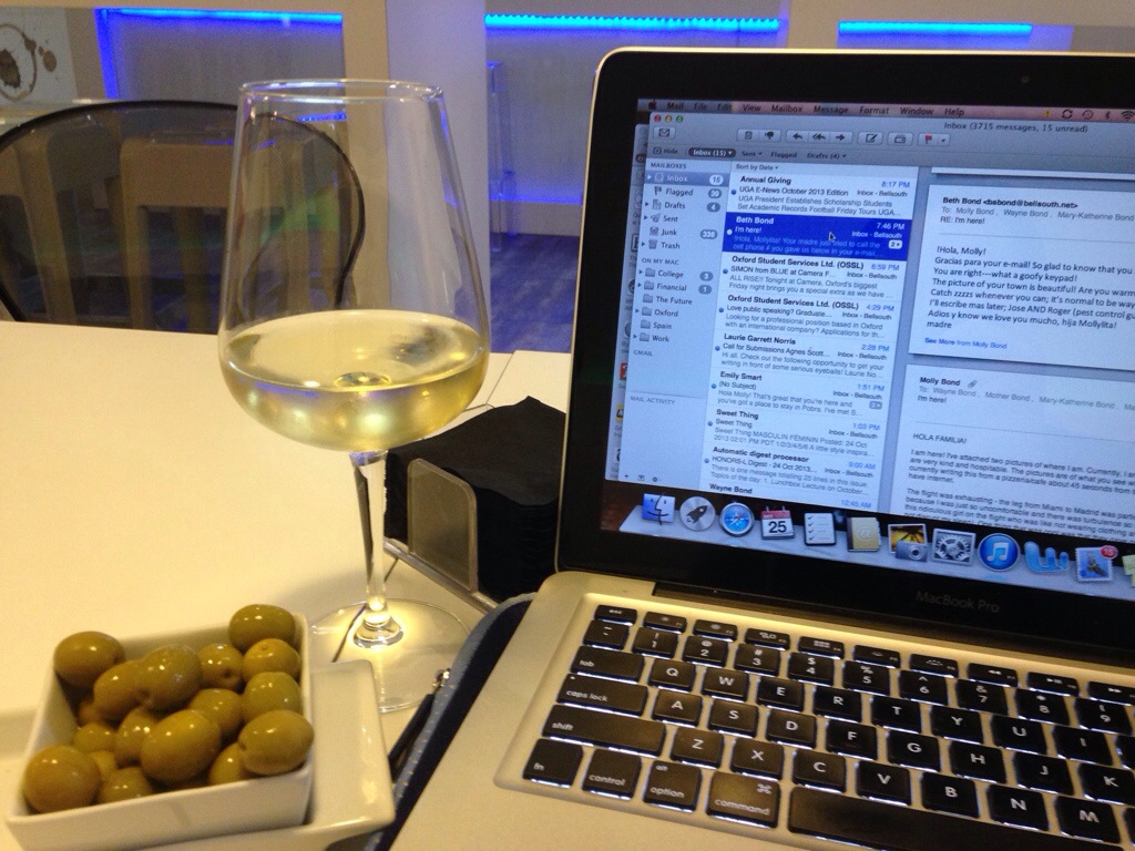 There is so much to tell, but that will have to wait. I am still bustling around, trying to figure out which city to live in. Right now, I am on my way to Santiago to meet with a potential roommate. I am currently crashing in a small town (absolutely precious) with two other auxiliares. However, they do not yet have internet, which means we must patronize the cafe-pizzeria a 45-second walk away to get wifi. This is not a terrible thing to have to do, unless you count the fact olives are served with my wine (olives are always a terrible thing).